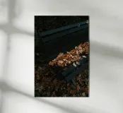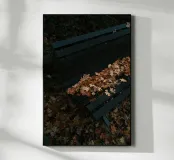 Crimson leaves drift down and settle on a quiet park bench, capturing the peaceful mood of autumn.