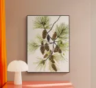 A detailed watercolor rendering of a pine branch bursting with cones and needles. This botanical study balances fine linework with loose washes, celebrating the structure and rhythm of pine growth. Earthy browns and fresh greens evoke the scent and stillness of forest surroundings.