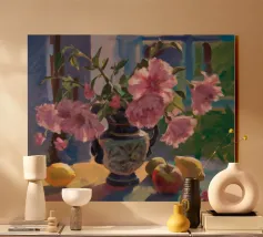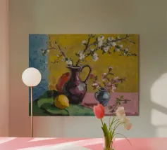 Un'audace natura morta con vivaci fiori rosso-rosa, forse papaveri o gerani, in un semplice vaso, accanto a fresche pere verdi, il tutto su una ricca tovaglia rossa che contrasta nettamente con uno sfondo blu intenso.