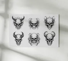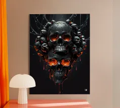 Diversi teschi sono appesi in una ragnatela di ragnatele e rami spinosi. La scena è in bianco e nero e appare oscura e misteriosa per la ricchezza dei dettagli. Un motivo a metà tra l'incubo e l'opera d'arte.