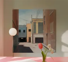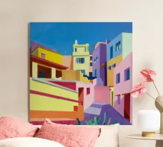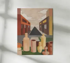 Un sentiero giallo brillante si snoda elegantemente attraverso un paesaggio minimalista di edifici grigi e squadrati. Il dipinto è uno studio sul contrasto dei colori e sulle forme geometriche pulite, che creano una scena urbana serena ma di grande impatto visivo.