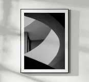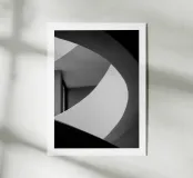 Poster in bianco e nero di architettura minimalista: curve organiche e spigoli vivi fotografati sotto una scala a chiocciola, vicino a una finestra. Il contrasto tra aree chiare e ombre profonde scolpisce una composizione fluida, geometrica e senza tempo, con delicate texture di stucco. Un elegante poster da parete che porta movimento, calma e modernità in salotto, camera da letto o ufficio, in stile contemporaneo, scandinavo, japandi o wabi-sabi.