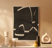 Una composizione astratta caratterizzata dalla sovrapposizione di curve e linee nere su uno sfondo beige. Il disegno gioca con i contrasti e le forme geometriche per creare un equilibrio tra movimento e immobilità.