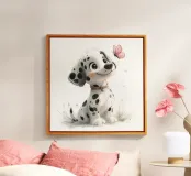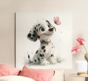 Un simpatico cucciolo di dalmata gioca felice in un prato fiorito, circondato da una farfalla e da fiori in un'incantevole illustrazione ad acquerello.