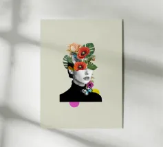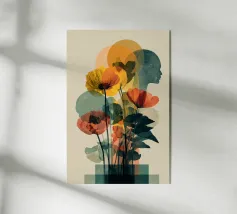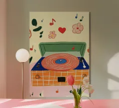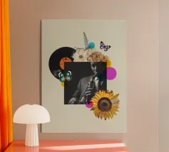 Una nostalgica stampa d'arte a collage che unisce fascino vintage e romanticismo. Un grammofono ornato esplode di fiori vivaci e dischi in vinile, mentre una coppia che balla cattura la magia della musica senza tempo. Un'opera d'arte da parete perfetta per gli amanti della musica, per gli appassionati di arredamento retrò o per chiunque sia attratto dalla narrazione di storie sentimentali attraverso il design.