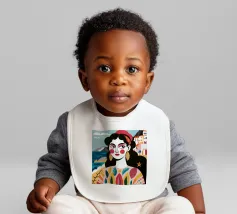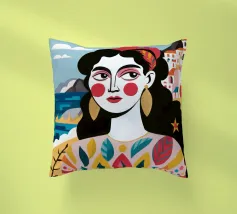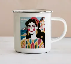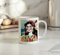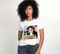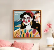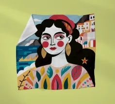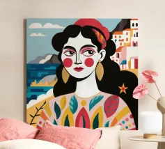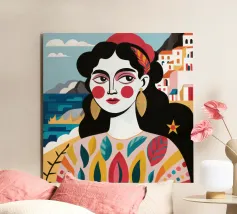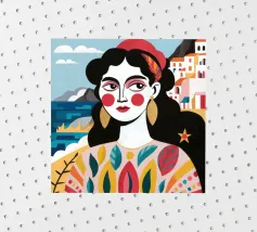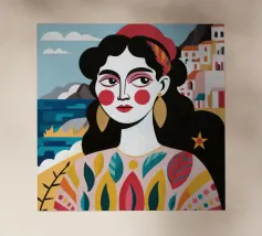 A portrait of a woman with large gold earrings and colorful clothing, with a picturesque seaside town in the background. The composition is a vibrant, powerful, and beautiful depiction of a modern goddess connected to her roots.