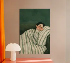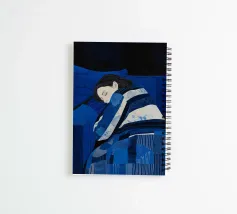 This artwork immerses the viewer in a nocturnal atmosphere shaped by deep blue tones and layered textures. The sleeping figure is gently enclosed by patterned fabric, merging body and environment into a single, tranquil form. Subtle highlights on the face contrast with the surrounding darkness, emphasizing vulnerability and calm. The patchwork of shapes and brushstrokes evokes warmth, memory, and protection, while the restrained palette transforms sleep into a quiet, meditative state suspended between awareness and dreams.