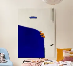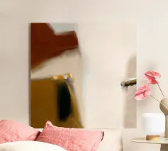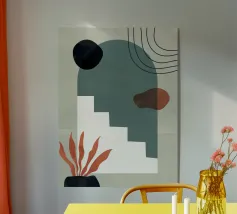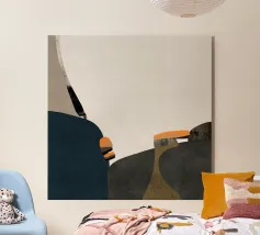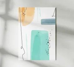 Opera d'arte astratta minimalista con una tavolozza di colori serena ed elegante: le morbide tonalità pastello come il verde turchese chiaro e il beige creano un'atmosfera rilassante, mentre il contrasto con il grigio scuro e l'arancione brillante aggiunge profondità e vivacità. Questa combinazione offre un'estetica minimalista e astratta con un tocco di raffinatezza. È un equilibrio di calma e interesse visivo, perfetto per creare uno spazio tranquillo ma visivamente accattivante.