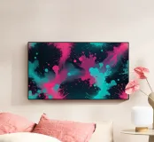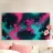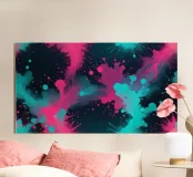 Spruzzi colorati di rosa e blu creano un energico disegno astratto su uno sfondo scuro, perfetto da usare come sfondo del desktop o decorazione artistica.