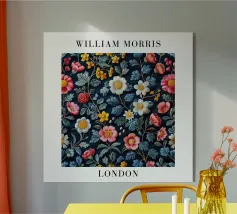 Questa raffinata opera d'arte di William Morris presenta un motivo floreale nei toni tenui dell'oro, del beige, del rosa e dell'arancio che celebra la bellezza senza tempo della natura. Con il suo stile distintivo e l'elegante tipografia, incarna la fusione di arte e design che Morris ha reso popolare in epoca vittoriana.