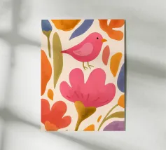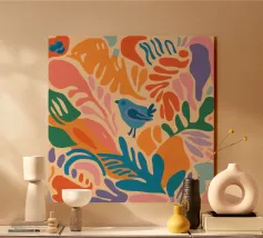 Questo incantevole disegno con uccelli colorati ed elementi floreali in blu, rosa, arancione e giallo dona un'allegra leggerezza a qualsiasi stanza. L'armoniosa combinazione di motivi naturali e colori vivaci lo rende un vero e proprio richiamo visivo. Perfetto per tazze, cuscini, murales o magliette: una scelta meravigliosa per chiunque voglia aggiungere un tocco di natura e creatività alla propria vita quotidiana.