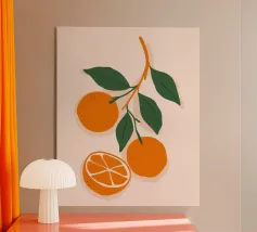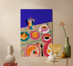 Illustrazione luminosa e allegra di un tavolo per la colazione illuminato dal sole, con caffè, succo d'arancia e pasticcini su un vivace sfondo giallo.