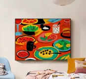 Una vibrante vista dall'alto di un banchetto di cibo festivo, con un gatto in mezzo a vari piatti come anguria, tacos e insalate. La scena è caotica, colorata e gioiosa.