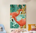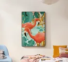 Two flamingos standing in the water, surrounded by plants, enjoying paddling! Fresh color combination of mint green, pink and ochre yellow, suitable for all rooms but especially the nursery and baby room. Digital illustration.
