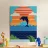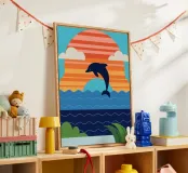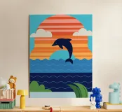Enjoy a vibrant ocean illustration featuring a dolphin leaping in front of a colorful sunset. With bold colors and a unique design, this artwork will bring a touch of the sea and artistic flair to your space.