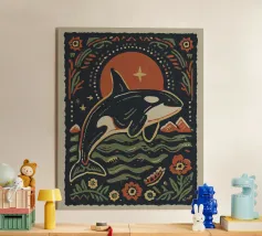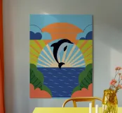 Enjoy a vibrant ocean illustration featuring a dolphin leaping in front of a colorful sunset. With bold colors and a unique design, this artwork will bring a touch of the sea and artistic flair to your space.