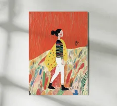 Una scena autunnale con una giovane donna che cammina lungo un sentiero che attraversa una colorata foresta autunnale. Lo sfondo è di un vivace azzurro cielo, che crea un contrasto deciso con le tonalità calde delle foglie e del fogliame autunnale. La donna indossa uno spesso maglione marrone, una sciarpa giallo senape avvolta attorno al collo e pantaloni a righe verticali arancioni, gialle e bianche che riprendono le tonalità autunnali circostanti.
