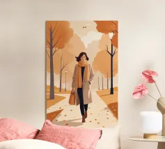 Donna che cammina in una foresta d'autunno plexiglass