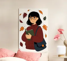 Una scena autunnale con una giovane donna che cammina lungo un sentiero che attraversa una colorata foresta autunnale. Lo sfondo è di un vivace azzurro cielo, che crea un contrasto deciso con le tonalità calde delle foglie e del fogliame autunnale. La donna indossa uno spesso maglione marrone, una sciarpa giallo senape avvolta attorno al collo e pantaloni a righe verticali arancioni, gialle e bianche che riprendono le tonalità autunnali circostanti.
