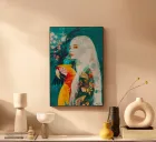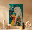 This magical-realistic composition fuses Frida Kahlo's tropical symbolism with contemporary digital art. The ethereal protagonist becomes a modern jungle goddess, while the magnificent macaw functions as a spiritual companion. The turquoise layers of colour are reminiscent of Hockney's pool paintings, but also create pure, exotic mysticism. This work of art is a hypnotic portal between dream and reality - ideal for lovers of surreal beauty combined with botanical luxury. An unmistakably unique piece that never lets go of your gaze.