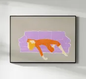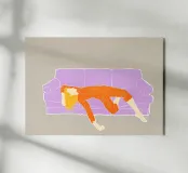 Questo disegno cattura la sensazione di uno di quei giorni in cui non c'è bisogno di fare nulla: basta sdraiarsi, respirare, essere. Una donna in tuta arancione pende rilassata su un divano viola, come se fosse immersa nel suo mondo di pensieri.