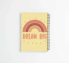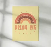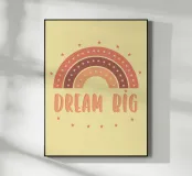 A rainbow in warm shades of orange and brown with Dream Big written on it. This boho chic design is perfect for those who want a touch of positivity and retro style in their spaces