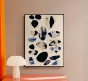 An abstract watercolor composition of scattered, organic shapes floating across a soft ivory ground. Inky blacks, deep indigo, and washed stone tones bleed and overlap, creating subtle texture and variation within each form. The loose spacing and irregular silhouettes give the piece a sense of lightness and quiet movement, balancing structure with spontaneity. Modern and restrained, this artwork works well in minimalist, contemporary, or gallery-style interiors, offering visual interest through contrast, rhythm, and negative space rather than overt imagery.