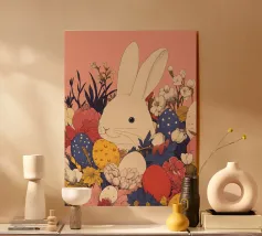 Due coniglietti pasquali stilizzati tra fiori colorati, pulcini e farfalle: un motivo allegro in stile poligonale, ideale per il periodo pasquale e l'inizio della primavera.