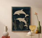 Due delfini che nuotano in acque blu profonde con morbide piante marine intorno a loro. I toni delicati e il movimento calmo creano una scena pacifica.