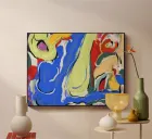 Bold swirls of blue and green intertwine with vibrant red and orange, creating a dynamic and energetic composition. Abstract forms and broad brushstrokes evoke a sense of motion and fluidity