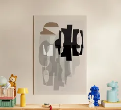 Composizione astratta moderna caratterizzata dall'uso di forme geometriche arrotondate, che conferiscono un senso di morbidezza e fluidità all'opera. Le forme sono stratificate e intervallate sulla tela, creando un gioco dinamico di forme. La ricca texture aggiunge profondità e qualità tattile al dipinto, invitando gli spettatori a esplorare la superficie più da vicino. Alcune sottili linee grigio-beige attraversano la tela, aggiungendo un senso di struttura e contrasto alle forme altrimenti morbide e organiche.