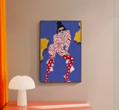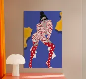 A high fashion illustration of a figure in a confident, dynamic pose, showcasing a bold clash of patterns with a geometric jacket and red polka dot pants, exuding pure energy.