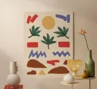 Un moderno motivo astratto con foglie stilizzate, zigzag e altre forme organiche in una tavolozza di colori terrosi. La composizione è un disegno equilibrato ed elegante, perfetto per l'arredamento contemporaneo.
