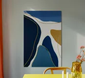 Blue and white curves fold around golden veins in sculptural quiet.