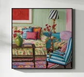 A vibrant, eclectic parlor filled with a mix of patterns and colors. A floral sofa, a striped armchair, and patterned wallpaper create a maximalist's dream, full of personality and creative energy.