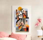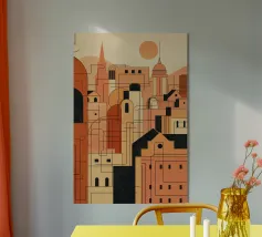 Paesaggio urbano stilizzato in una resa piatta e astratta, caratterizzata da forme geometriche ed elementi grafici audaci. La composizione minimalista utilizza i toni tenui del grigio, dell'arancione, del beige e del blu e combina influenze cubiste con linee pulite e motivi simmetrici su uno sfondo bianco, creando un design elegante e moderno. Gli elementi sono stati realizzati a partire da schizzi in Adobe Illustrator e poi combinati in Photoshop.