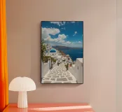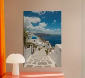 Edifici imbiancati e sentiero di pietra a Santorini plexiglass