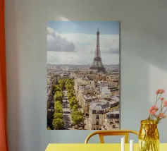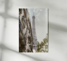 Una vista incantevole della Torre Eiffel che si erge sui tetti parigini, incorniciata da un cielo inondato dai colori tenui del crepuscolo. Il gioco di camini rustici e tetti metallici sullo sfondo pastello evidenzia la miscela unica di fascino antico ed eleganza moderna della città. Questa immagine cattura lo spirito sereno ma vibrante di Parigi, offrendo agli spettatori uno sguardo sulla bellezza quotidiana del suo paesaggio urbano. La Torre Eiffel, come elemento centrale, emana un fascino senza tempo in mezzo a un ambiente pittoresco.