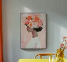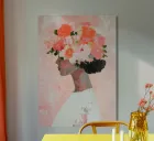 A minimalist painting of an elegant woman with flowers in her hair against a pink background. The woman is wearing a white dress, with peach and coral colours accentuating the thick brushstrokes.