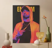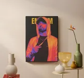 Un uomo con una felpa con cappuccio posa con sicurezza con un volto serio su uno sfondo scuro, il nome "EMINEM" alle sue spalle.