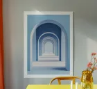 A minimalist, modern illustration of a series of blue arches, creating an infinite, soothing perspective. The design plays on soft, luminous tones, offering a clean, contemporary architectural aesthetic. Perfect for evoking an atmosphere of serenity and depth, this visual captures the beauty of geometric lines and the play of shadows with timeless elegance.