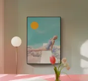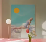 A minimalist retro collage that captures the carefree spirit of summer. A woman basking in the sunlight above the clouds becomes a symbol of joy, freedom and longing for warm days. The simple composition with bold colors brings nostalgic vibes and dreamy lightness, making it a perfect artwork for anyone missing the sun, holidays and endless summer feelings.