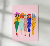 Un'illustrazione Pop Art vibrante e dinamica con cinque donne in posa in fila su uno sfondo rosa tenue. Le figure sono stilizzate, con un'enfasi sulle silhouette sinuose e sulla moda drammatica, e indossano abiti colorati e pieni di motivi e tute a maniche lunghe. I capi sono un mix audace di motivi astratti classici, tra cui grandi pois gialli e verdi e vistose strisce ondulate in blu, bianco e rosso, che ricordano la moda degli anni '80 e '90. Completata da cappelli o berretti a tesa larga e occhiali da sole audaci, quest'opera d'arte è una vera e propria dichiarazione massimalista. Consegnato in anteprima