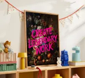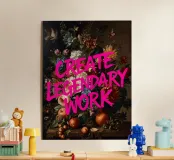L'immagine raffigura una natura morta di una lussureggiante composizione floreale con frutti, cui si sovrappone il testo "CREATE LEGENDARY WORK" in rosa acceso. I fiori comprendono rose, dalie e altre fioriture nei toni del bianco, del rosa, del blu e dell'arancio. Alla base del vaso sono disposti frutti come mele, arance e piccole bacche. Le farfalle volteggiano intorno ai fiori, aggiungendo un tocco di estrosità.