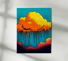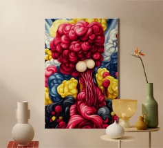 Un vortice surreale di colori e forme si dispiega in onde dinamiche. Vortici rossi, gialli, blu e bianchi si fondono in una composizione esplosiva che ricorda la formazione di una nuvola vivente. La texture scultorea crea una profondità quasi tangibile, mentre i giochi di luce enfatizzano i singoli strati di colore. La struttura potente e l'interazione tra ordine e caos fanno pulsare il quadro in un ritmo drammatico.