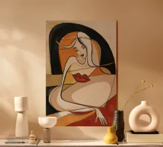 Questo dipinto raffigura una figura in posa giocosa, circondata da forme geometriche e colori vivaci. La composizione evidenzia la gioia e la spontaneità della scena.