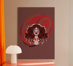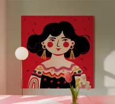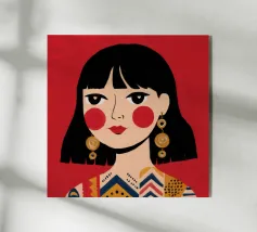 Questo dipinto raffigura una persona con i capelli scuri acconciati in due chignon, che indossa grandi orecchini arancioni. Il volto della persona è dipinto con audaci motivi rossi e bianchi, mentre lo sfondo è di colore rosso pieno.