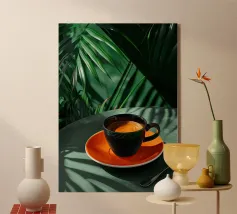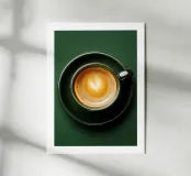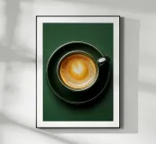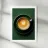 Vista dall'alto di un espresso cremoso in una tazza e un piattino verde intenso, con un cuore di latte art che galleggia sulla ricca crema. Lo sfondo tono su tono e la composizione minimalista mettono in risalto la ceramica lucida e le calde tonalità del caffè, creando un accento di design pulito per una cucina, un angolo caffè, un bar o un ufficio. Moderna, elegante e rassicurante, questa decorazione murale aggiunge calore, raffinatezza e attenzione a qualsiasi spazio.