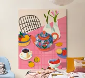 Questa calda composizione illustra un tavolo ornato da una teiera, tazze e frutta assortita. L'estrosa tovaglia rosa e i motivi astratti ne esaltano il fascino invitante.