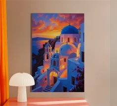 Un'ipnotica pittura a olio che cattura l'incantevole bellezza di Santorini al tramonto. Le iconiche chiese dalle cupole blu sono immerse nella calda luce di un tramonto vibrante, con sfumature di arancio, rosa e viola che si fondono con il blu profondo del mare. Le strutture a cascata imbiancate a calce creano un'armonia visiva sorprendente, ornata da bouganville in fiore che aggiungono sprazzi di colore vivace. Questo ritratto senza tempo racchiude il romanticismo, la serenità e i panorami mozzafiato dell'isola.